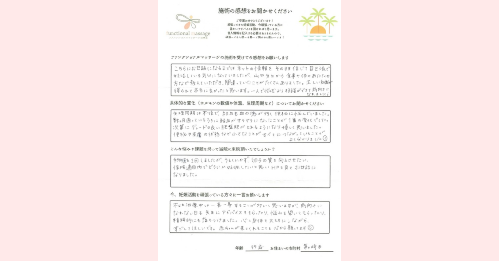 実際にファンクショナルマッサージを受けて妊娠された方の体験談を紹介します。先生からのアドバイスや施術による変化、これから妊活を続ける方へのメッセージをぜひご参考にしてください。